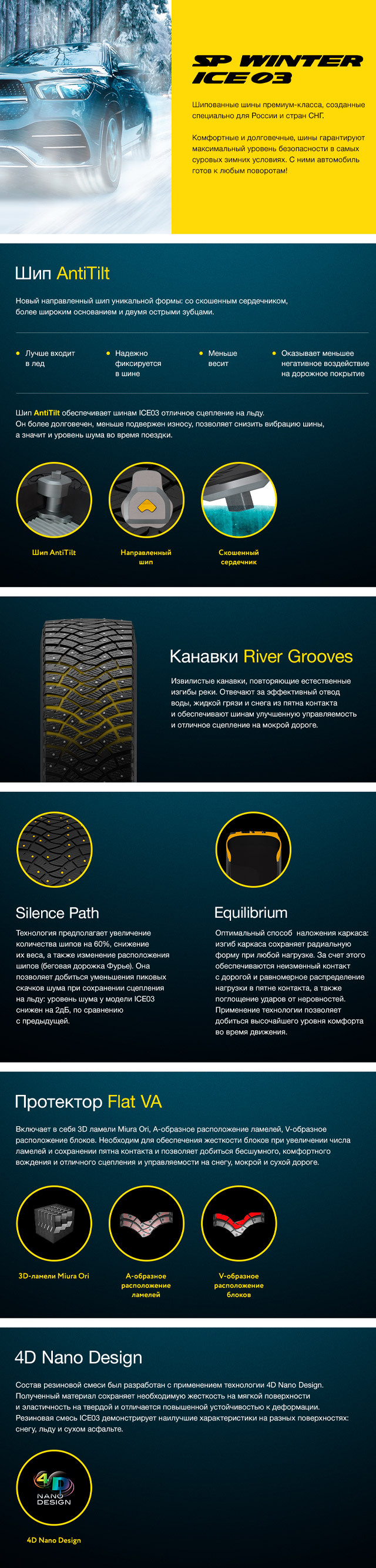 Основанная на анализе материалов на молекулярном уровне фирменная технология 4D Nano позволила создать такую резиновую смесь, которая на мягкой поверхности характеризуется жёсткостью, а на твёрдой – повышенной эластичностью, что оптимизирует сцепление Dunlop SP Winter Ice 03 на любых зимних покрытиях.